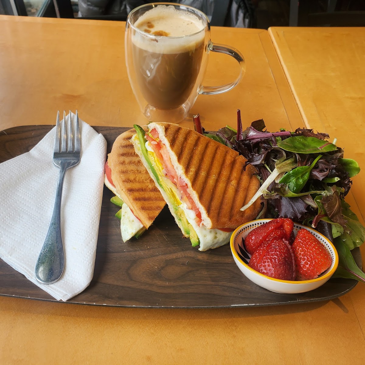 Finally got to try this cafe and I wasn't dissapointed. Friendly atmosphere and good service. I ordered a dirty chai latte and the pressed avocado sandwich which came with spring salad and fresh strawberries. The food was delicious, good portion and decent price. Definitely recommend